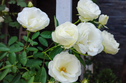 • Iceberg Roses – Repeated flushes of white roses add romance and reflect beautifully in evening light.