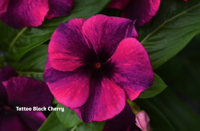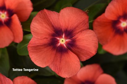 Tattoo Black Cherry vinca features rich cherry-red petals highlighted by dramatic dark centers, creating a striking contrast that stands out even from a distance. Tattoo Tangerine vinca, on the other hand, offers bright orange petals accented with a unique darker center, adding both color and texture to sunny spaces.