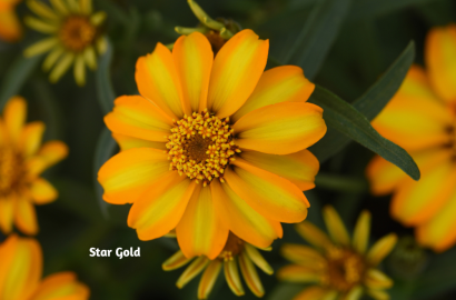 Zinnia Swizzle Cherry Ivory combines creamy ivory petals with bold cherry-red centers, creating a vibrant, candy-like effect that works beautifully in cutting gardens and borders. Zinnia Star Gold adds a sunny burst of color with its bright yellow and gold petals, making it a perfect choice for adding brightness and structure to sunny beds.