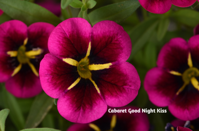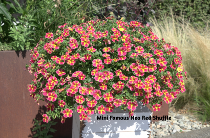 The Cabaret Good Night Kiss calibrachoa is a standout with its rose petals with burgundy overtones and yellow stripes that lead to an almost glowing center. It’s the kind of flower that instantly catches your eye and holds your attention. For something a bit more playful, Mini Famous Neo Red Shuffle calibrachoa offers bold red tones layered with a dynamic pattern that adds energy to any planting.
