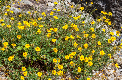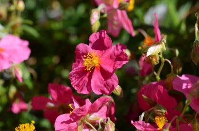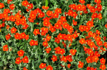Helianthemum, commonly known as rock rose or sun rose, is a genus of about 110 species of low-growing, evergreen or semi-evergreen shrubs and perennials in the Cistaceae family, native to Europe, North Africa, and western Asia. These plants are hardy in USDA Zones 5–8 and are valued for their profuse, delicate, papery flowers that resemble miniature roses, blooming heavily in late spring to early summer, often with sporadic reblooming later in the season. Flower colors include yellow, orange, pink, red, and white, frequently with contrasting centers. Helianthemum thrives in full sun and sharply drained, sandy or gravelly soils, making it ideal for rock gardens, slopes, borders, and ground cover applications. It is typically grown from starter plants or cuttings rather than seed for consistency. Care is minimal—plants are drought-tolerant once established and benefit from light shearing after flowering to maintain a compact shape. Avoid overly rich soils or excessive moisture, which can reduce longevity. An interesting feature is that the flowers open in the morning and often close by afternoon, especially in hot weather, giving the plant a dynamic daily rhythm in the garden.