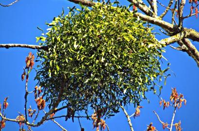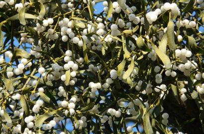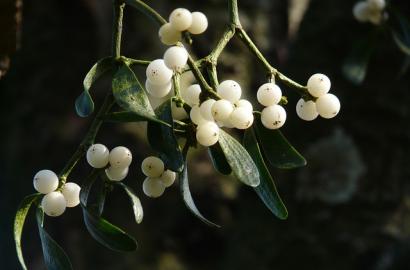 Mistletoe, botanically known as Viscum album in Europe and Phoradendron leucarpum in North America, is a fascinating evergreen perennial plant recognized for its rich folklore and its unusual lifestyle as a hemiparasite, meaning it can photosynthesize but also relies on host trees like oaks, maples, and apples for water and nutrients. With roughly 1,000 species found worldwide, mistletoe is native to parts of Europe, North America, and Asia, where it typically grows high in tree canopies rather than in the soil like traditional garden plants. Its flowers are small, waxy, and often overlooked, appearing in late winter to early spring; they come in subtle shades of yellow, cream, or greenish-white, eventually giving way to the familiar white or translucent berries. Because mistletoe grows only on host trees, it cannot be used as a bedding, border, or container plant, and gardeners typically propagate it using fresh seeds harvested from ripe berries. These seeds must be pressed onto the bark of a suitable host branch to germinate. Mistletoe requires full sun to partial shade (depending on the host tree’s canopy), consistent moisture provided naturally by the host, and minimal care once established, though some gardeners gently manage growth to prevent overwhelming the host tree. Hardy in USDA Zones 6–11, depending on species, mistletoe is best appreciated for its ecological and cultural value: its berries provide winter food for birds, its dense clumps offer shelter for wildlife, and it has been associated with holiday traditions, peace, and good luck since ancient times.
